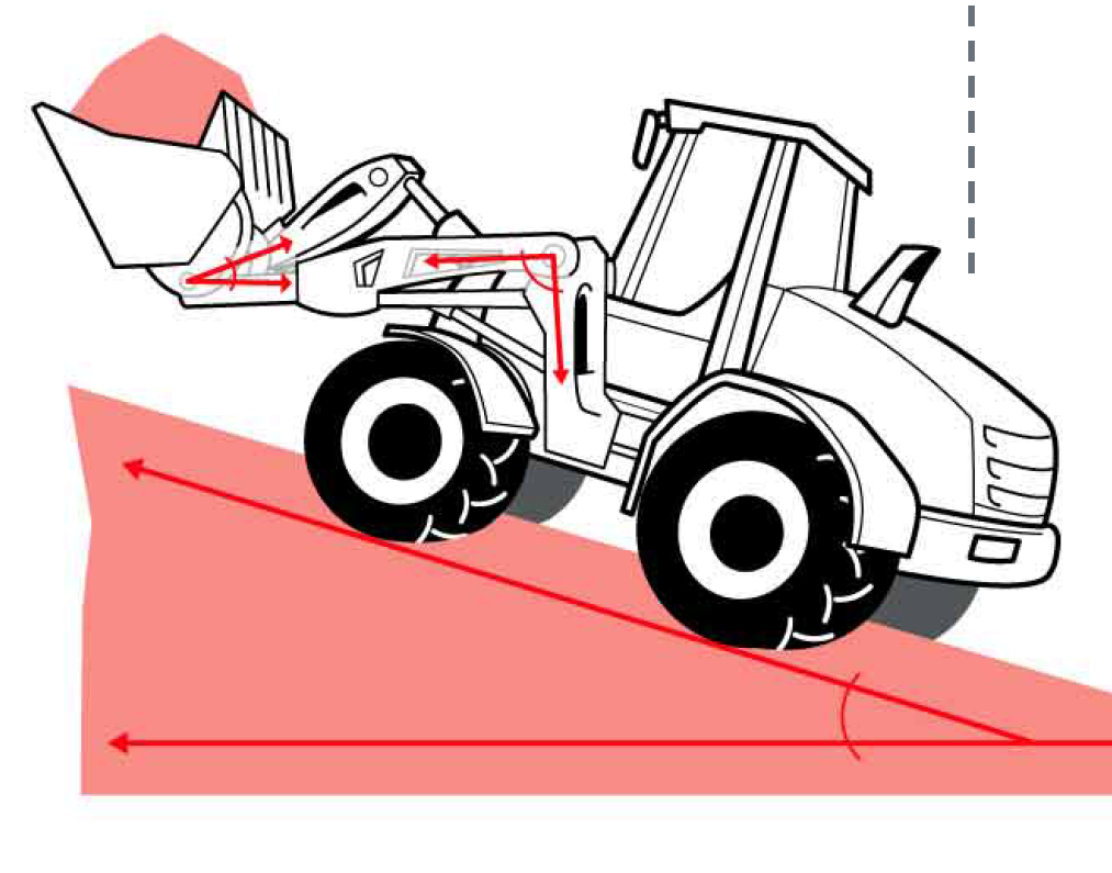 由于测量装置与地球重力矢量之间的角度导致称重装置读数不准确,需要对倾斜角度进行补偿。 地球重力矢量与测量装置之间的角度(称重传感器灵敏度轴)到时输出读数错误,这种错误产生的原因可能是设备移动了,或者设备位于不平坦的表面,为了获得准确读数,需要相应的平衡或者得到这一角度进行补偿。 例如如下图所示的铲车,位于倾斜面上,如果不进行角度的补偿,有可能因为称重错误,读数不准确而发生车辆超载、侧翻等危险。