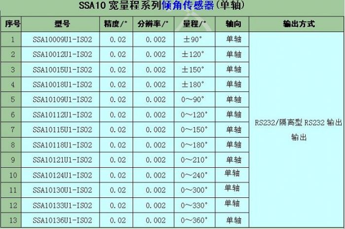 硕锋科技于2013年3月15日正式发布大量程系列角度传感器,该系列传感器命名为SSA10系列,取消原来SSA01系列,由SSA10系列取代。该系列全部为单轴产品,角度测量范围0-360度全量程都可以,每隔30度设置一种型号,目前只有RS232输出方式, 在产品正式发布之前,让我们首先了解下该系列的特点: 下图是该系列产品的选型: