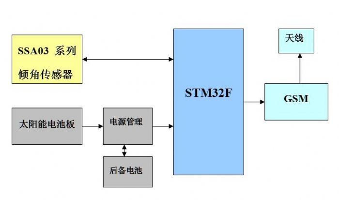 我们采用硕锋科技公司研发的一款双轴高精度倾角传感器SSA03系列,它具有低温依赖性好、精度高、产品成熟、稳定可靠、产品寿命长等一系列特点,适合各种野外环境下工作,通过双轴高精度倾角传感器数据的读取,以获取铁塔在线路输电方向和横向几个方向的倾斜角度,由中央控制系统对数据进行分析,当倾斜角度达到所设定的预值时,将相关数据发送到监控中心,由相关输电线管理人员及时作出处理,以解除故障,确保电网的安全运行。